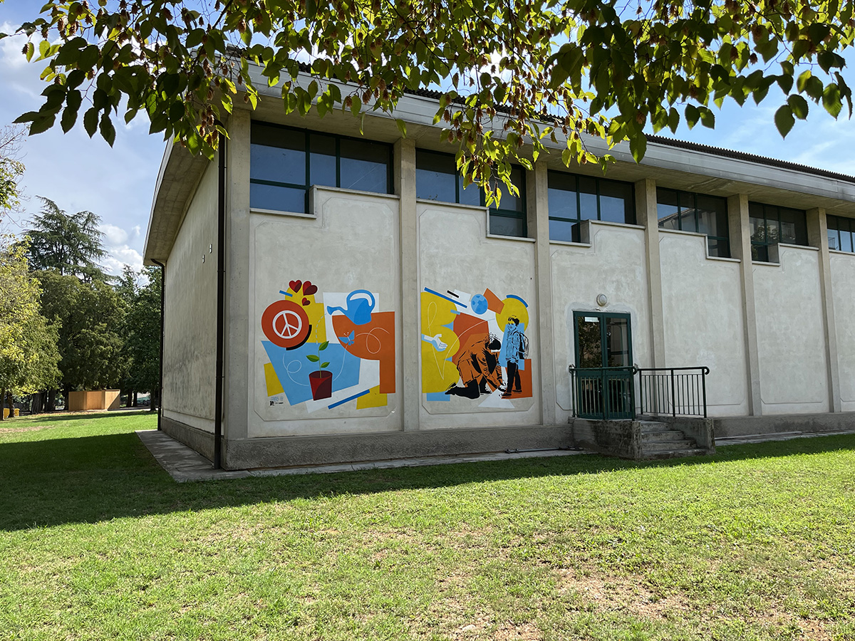 I had the honor of creating two murals at Treviso's Coletti and Carducci schools. Both schools took part at the "Kepler 5-14" Project, with a theme centered around "care". It was a funny experience involving the students in the creative process, as they contributed to designing and bringing the artwork to life alongside a stencil by the street artist LDB.